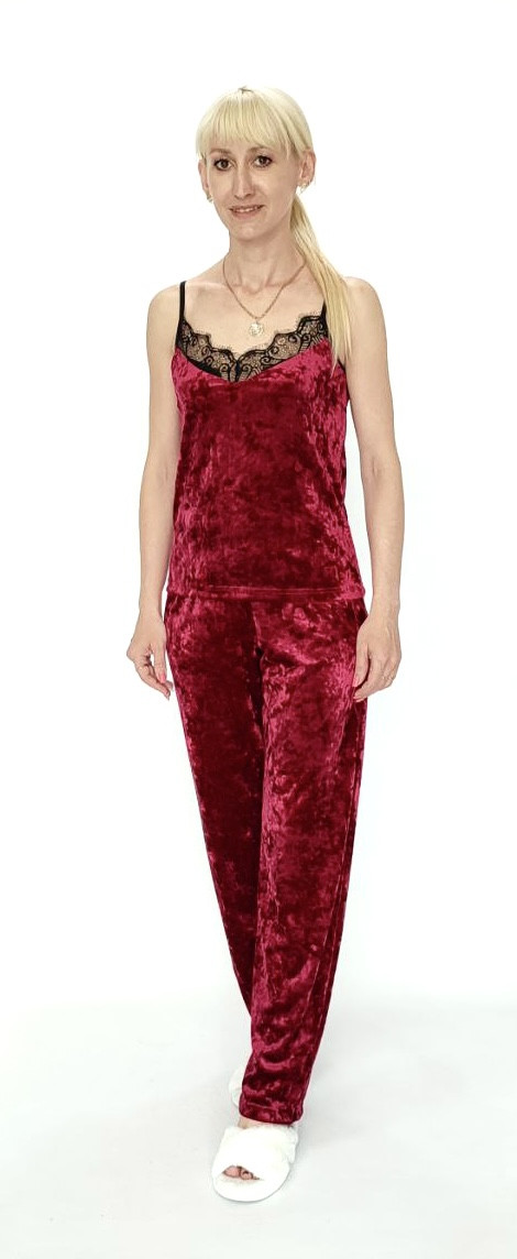 Одяг для дому та сну піжама жіночий велюровий. Комплект складається з майки та штанів, пошитий з трохи еластичного мармурового велюру тканина з коротким ворсом і ніжним відливом.У такому комплекті вдома ви завжди матимете романтичний та жіночний вигляд. Майка вільна з не глибоким вирізом, обшитим шикарним бавовняним фігурним мереживом на тонких еластичних лямках.