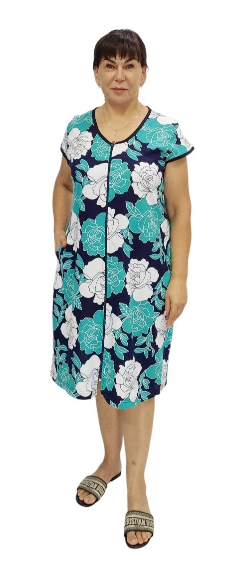 Кольоровий трикотажний халат на блискавці, від виробника Triko. Халат пошитий із бавовняного трикотажного полотна, вільного крою, до коліна та дві бічні кишені.